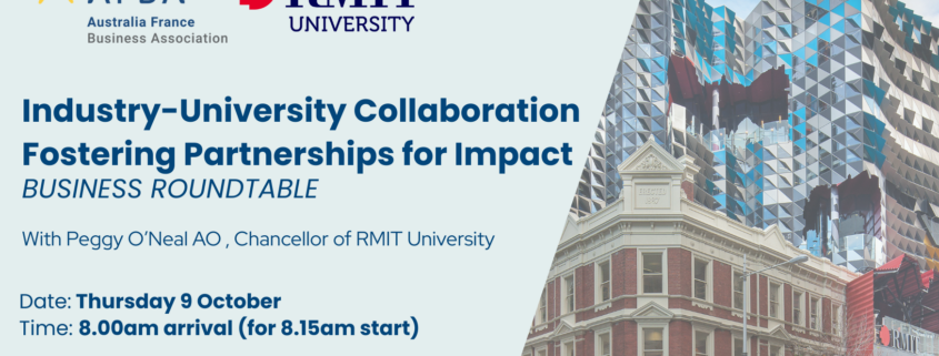 To mark the visit to Europe by higher education leaders Chancellor Peggy O’Neal AO and Professor Alec Cameron from RMIT University, the Australia France Business Association (AFBA) is hosting a business roundtable on ‘Industry-University Collaboration: Fostering Partnerships for Impact’.