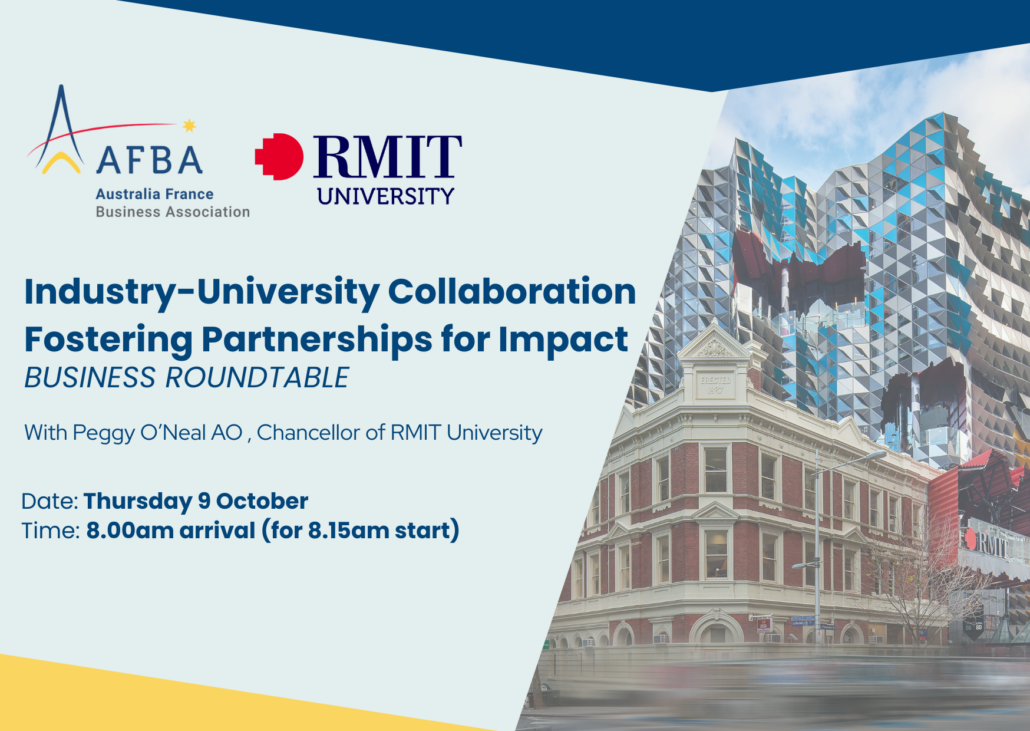 To mark the visit to Europe by higher education leaders Chancellor Peggy O’Neal AO and Professor Alec Cameron from RMIT University, the Australia France Business Association (AFBA) is hosting a business roundtable on ‘Industry-University Collaboration: Fostering Partnerships for Impact’.
