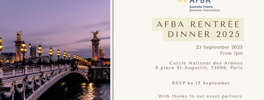 The President and Board of the Australia France Business Association are delighted to invite members and friends to our annual AFBA Rentrée Dinner 2025, one of the most anticipated events on the AFBA calendar.